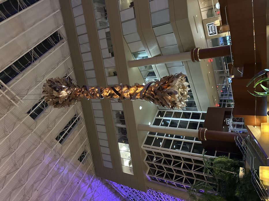 A view looking up inside a large building reveals a high, peaked ceiling with a grid-like structure and skylights. An elongated, abstract sculpture hangs suspended, resembling a garland of dried leaves or flowers wrapped around a central core. The building's interior features multiple levels with windows, offering glimpses of the spaces within. Lush greenery is visible at the base of the image, adding a touch of nature to the modern architecture.