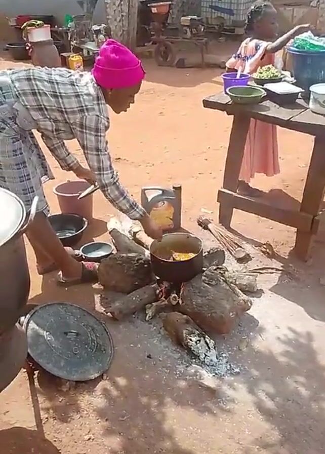 A woman wearing a pink cap and plaid shirt tends to a pot cooking over an open fire built on the ground. She uses a pot lid, a knife, and a container of cooking oil. A young girl stands behind a table with several containers on it. The cooking area is outside, with a building in the background. There are other pots, buckets, and tools scattered around the cooking area.