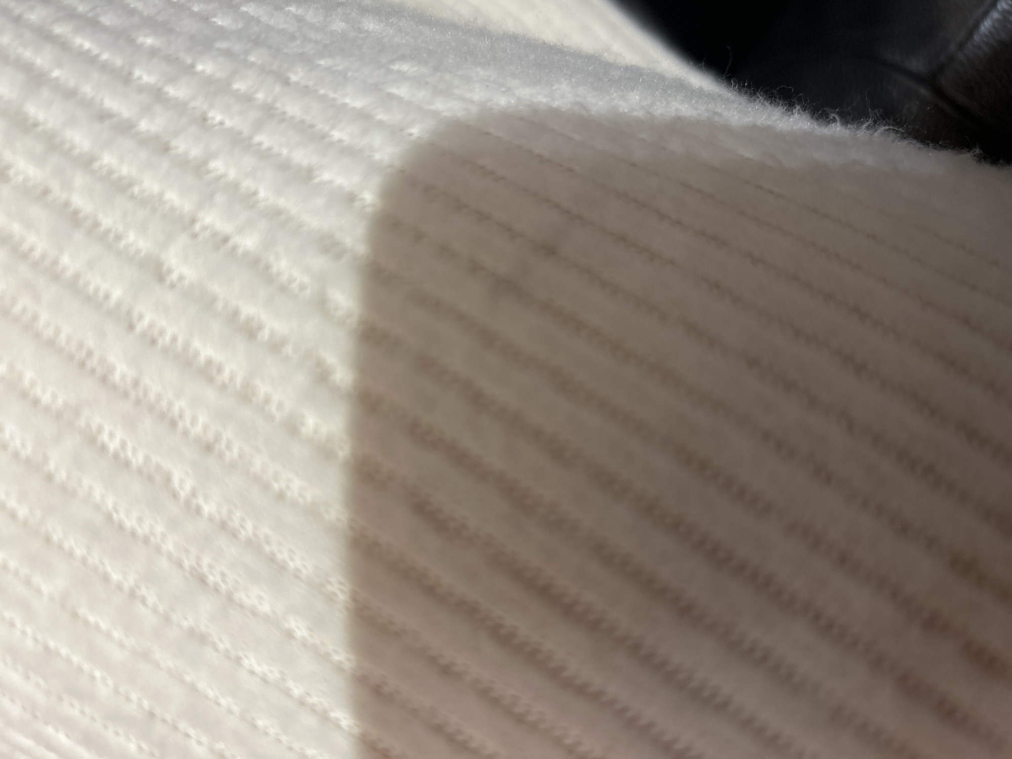 The scene, located in the Spata-Loutsa Municipal Unit, Greece, depicts a close-up, oblique view of an off-white, ribbed textile material. The ribs run diagonally from the upper left to the lower right of the frame, exhibiting a soft, slightly fuzzy texture. A soft-edged shadow extends across the lower-left portion of the fabric. On the far right edge, a dark, indeterminate object or surface, possibly leather or a dense dark fabric, is partially visible. No individuals, actions, or direct interactions are present within the depicted area.