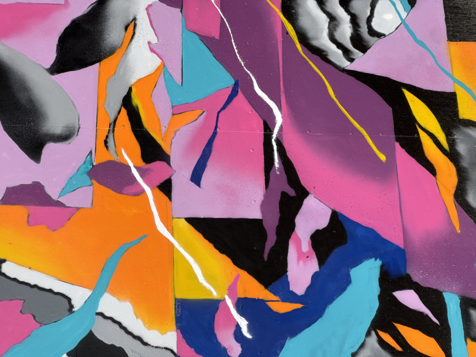 An abstract graffiti mural is depicted, characterized by a dynamic arrangement of overlapping and interlocking irregular shapes
