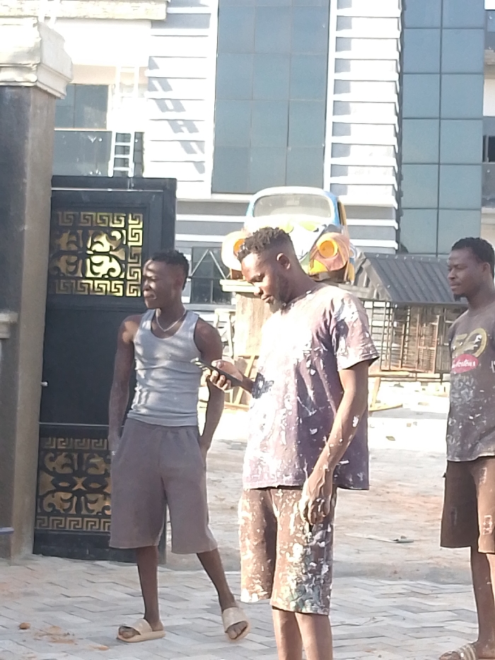 Three adult males stand on a paved surface in Kwang, Nigeria. The individual on the left, wearing a grey tank top and brown shorts with light slides, holds a dark smartphone in his right hand. The central figure, bearded, wears a dark t-shirt and brown shorts heavily splattered with paint, focusing on a black smartphone held in his left hand. The third male, on the right, wears a paint-stained dark t-shirt and brown shorts. Behind them, a black metal gate with gold Greek key patterns is visible. Further back, an elevated, light blue and yellow/orange painted Volkswagen Beetle shell is positioned in front of a modern multi-story building featuring extensive blue-tinted glass windows and light-colored paneling. The ground consists of interlocking pavers with minor debris. The scene is illuminated by strong natural light.