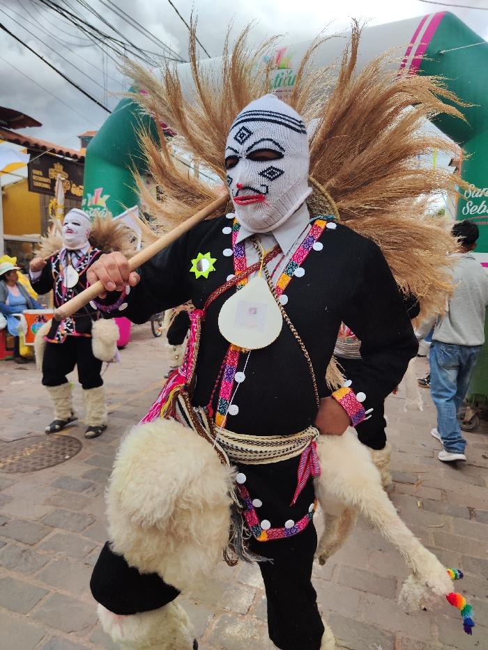 A man in a striking costume with a white knitted mask featuring geometric eye and mouth designs. He wears a black suit with colorful trims, buttons, and a straw-like headdress. He carries a wooden staff. The costume includes woolly, off-white leg coverings resembling animal fur. Another similarly dressed individual is visible in the background, along with onlookers. The setting appears to be a street during a festival or parade.