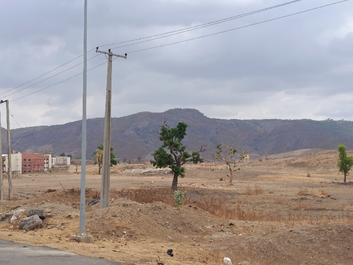 The image depicts an expansive, arid landscape in Rafin Pa, Nigeria, under an overcast sky. In the foreground, a dark gray paved surface is visible on the bottom left, leading to an undeveloped terrain characterized by light brown soil, dry vegetation, and scattered piles of dirt and concrete debris. Three utility poles with overhead power lines traverse the upper midground; one tall metal pole stands centrally, flanked by two shorter wooden poles. Several sparse trees with minimal green foliage are distributed across the dry field, with one prominent green-leafed tree slightly left of center. In the far midground, to the left, a cluster of multi-story buildings, featuring brick-red and beige facades, is visible. Further right, a light-colored water tower or similar structure stands against the distant mountains. The background is dominated by a range of rugged, brown-gray mountains with sparse vegetation. No individuals, specific actions, or interactions are observable.