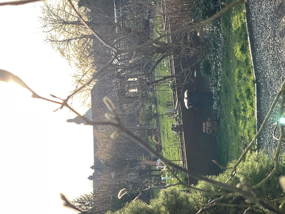The image presents an outdoor garden scene in Foetz, Luxembourg, under bright, low-angle sunlight. The foreground is partially obscured by out-of-focus, bare tree branches displaying numerous developing buds, possibly pussy willows, along with a portion of a green coniferous bush on the left. A gravel pathway occupies the lower section of the frame. The midground features a well-maintained green lawn. Visible garden elements include a decorative bird bath or statue, two heart-shaped signs on stakes, and scattered small spring flowers, all located on the left side of the lawn. A dark, possibly rusted, metal wall or raised garden bed extends horizontally across the central midground. Positioned in front of this wall are a black, lidded compost bin and a terracotta multi-tiered planter. Behind the wall, several bare deciduous trees and bushes are present, with at least two bird feeders (one square, one round) suspended from their branches. The background reveals multiple buildings against a bright, hazy sky. A prominent structure with a distinctive spire or cupola is discernible, flanked by other buildings featuring gabled roofs and additional bare trees. No individuals are visible within the scene.