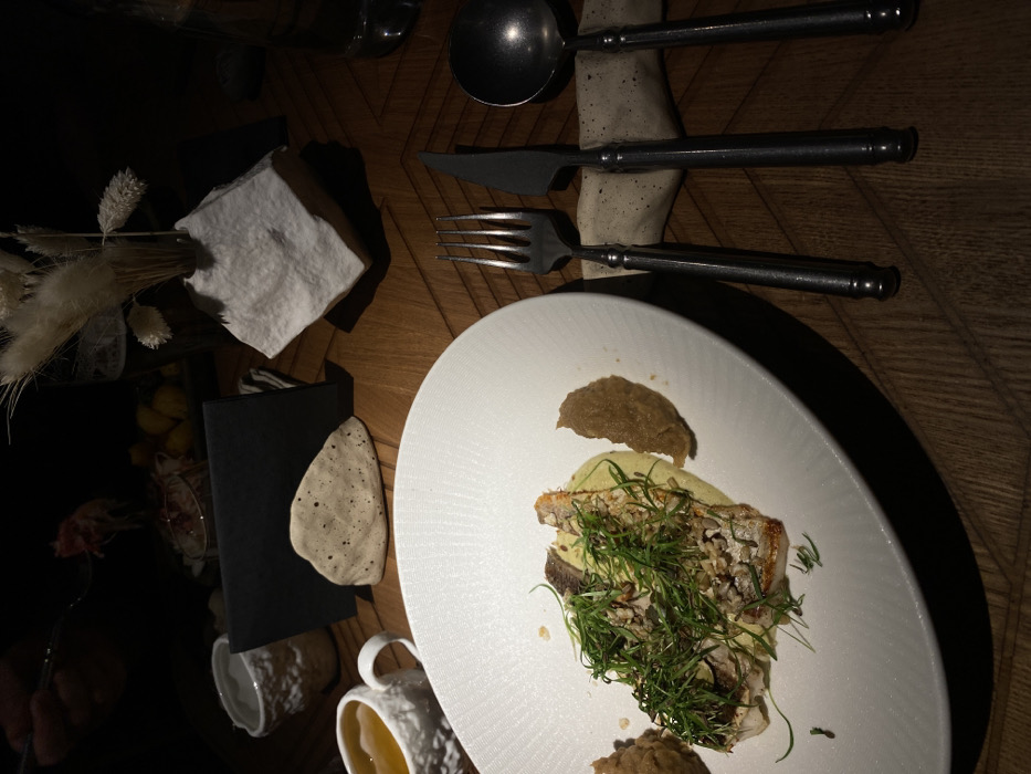 The image depicts a dining table scene in a dimly lit restaurant located in Irkutsk, Russia. In the foreground, a white, textured plate holds a main course consisting of two pieces of pan-seared fish with a crunchy topping, resting on a bed of light-colored mashed puree. The dish is garnished with fresh green microgreens and scattered seeds. A small, brown-colored dollop of sauce or puree is also present on the plate. To the right of the plate, a polished silver fork, knife, and spoon are neatly arranged on a light-colored napkin. To the left, a white, textured mug containing an orange liquid (possibly tea or broth) is visible. Further back on the wooden table, which exhibits a subtle chevron pattern, a black rectangular menu or card is held upright in a speckled, organic-shaped ceramic stand. Adjacent to this, a geometric white ceramic vase holds dried, light-colored feathery ornamental grass. In the upper left background, a person's hand is visible, holding a fork with food on it, indicating another diner at the table. Other dimly lit objects in the background include additional glassware, a small dish containing yellow citrus halves, and other indistinct food items, suggesting a shared meal. The overall lighting is low, with focused illumination on the main table setting.