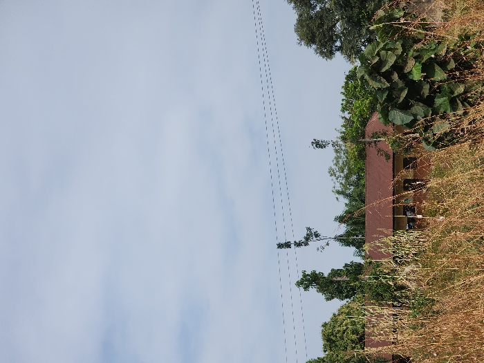 The image displays a rural or semi-urban landscape in Akwanga, Nigeria, under a partly cloudy, light blue sky. Four horizontal power lines are visible in the upper mid-ground. The foreground consists of dense, dry, yellowish-brown grass and stalks, including some green broadleaf vegetation on the right. In the mid-ground, partially obscured by foliage, stands a single-story building featuring a reddish-brown corrugated metal roof and light-colored walls. Several dark rectangular openings, consistent with windows or doorways, are visible on the building's facade. Various trees and dense green shrubbery surround the structure and extend towards the background. No individuals, overt actions, or identifiable vehicles are present within the captured scene.