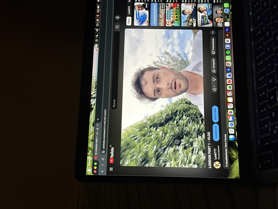 The image forensically depicts a MacBook laptop screen in a dimly lit indoor setting, consistent with a location in Lo Barnechea, Chile. The laptop is displaying the Google Chrome browser, which is open to the YouTube website. A video titled "LONDON PART 1 - VLOG" by the channel "Lucki777" is visible, featuring a young adult Caucasian male with curly brown hair, wearing a white collared shirt. He is shown outdoors with a dense green hedge or foliage wall behind him on the left and a partly cloudy sky to his right, his mouth slightly open. The YouTube interface indicates "9 visualizaciones hace 3 horas" (9 views 3 hours ago) and is displayed in Spanish, with recommended videos visible on the right sidebar. The macOS menu bar shows the Apple logo, Chrome menu options, and system icons including a 58% battery charge and the time "10:12 PM." A portion of the laptop's QWERTY keyboard is visible at the bottom, along with the macOS Dock containing icons for applications such as Chrome, WhatsApp, Spotify, Adobe Illustrator, and Adobe Premiere Pro. A wooden surface is partially visible on the left edge of the frame.