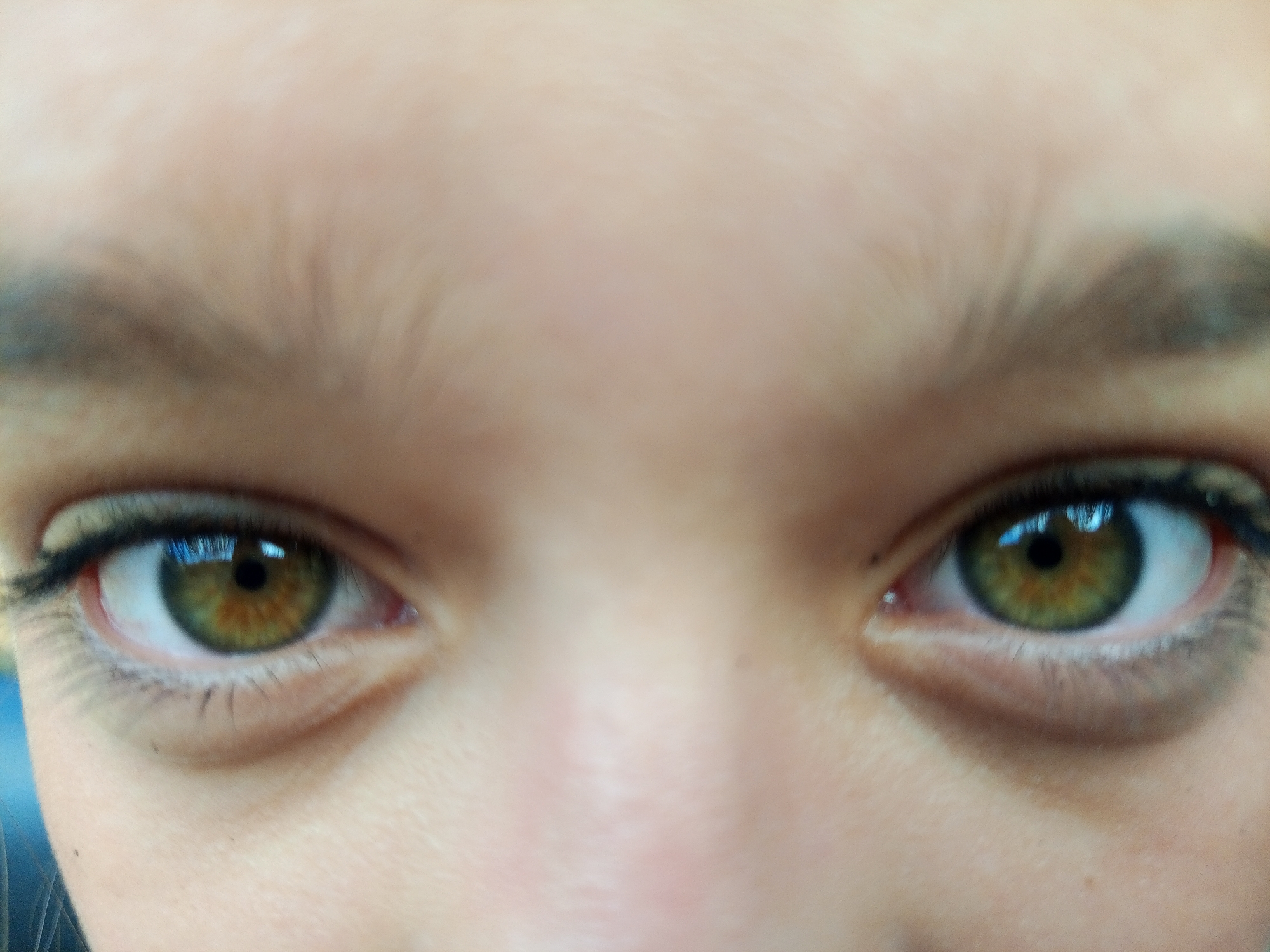 A close-up image of a person's eyes and eyebrows is presented. The eyes are hazel-colored, with a visible pupil and iris. Eyelashes are present on both upper and lower eyelids, and there is eyeliner applied. The eyebrows are dark and thick. The skin appears fair with some texture. The photo focuses solely on this facial area. There is no geographical information available.