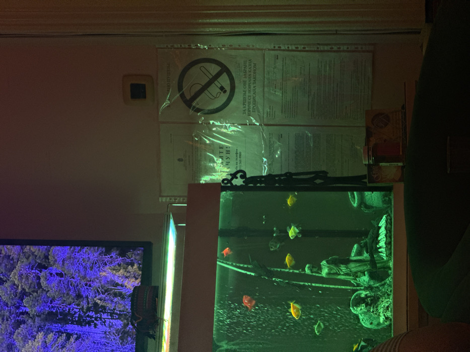 A "No Smoking" sign in Cyrillic hangs on the wall above an aquarium with brightly colored fish