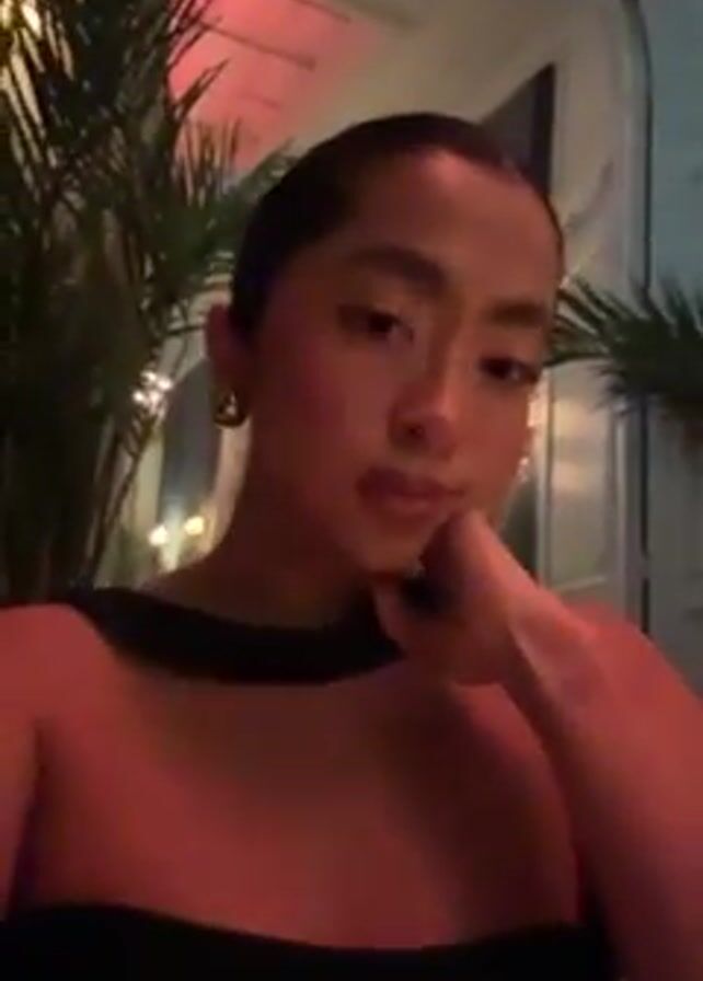 The video features a woman with her hair pulled back, wearing a black top, and gold hoop earrings. She rests her chin on her hand and looks into the camera. She then pouts her lips and continues to look at the camera. Behind her are potted plants and a window. The video is lit with a red glow.
