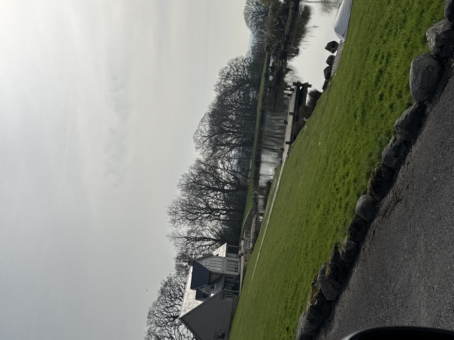 The image presents a tranquil waterside property situated within the Borough of Wyre, United Kingdom, observed during daylight under an overcast sky. In the mid-ground left, a contemporary residence features light-colored siding, a dark slate-grey gabled roof, and multiple windows, including a large bay window facing a body of water. A paved patio with outdoor furniture is positioned directly in front of the house, adjacent to the water's edge. An extensive, well-maintained green lawn slopes from the foreground down towards the house and the water. A calm, dark-toned body of water, possibly a pond or small lake, occupies the mid-ground, reflecting the sky and surrounding trees. A wooden jetty extends from the grassy bank into the water on the right side of the frame. Further to the right, a small, light-colored boat rests on the grass near the water's edge. The far bank of the water and the background are densely populated with deciduous trees exhibiting bare branches, indicative of a late winter or early spring season. The immediate foreground consists of a dark asphalt surface, presumably a driveway, separated from the lawn by a line of irregular, moss-covered stones. No individuals or animals are present in the scene.