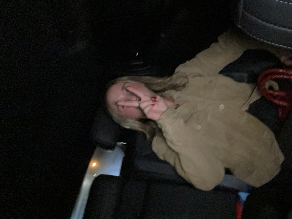 A person reclines in a vehicle's back seat, holding up a peace sign. The subject is wearing a tan button-down shirt and has blonde hair. A car seat with black leather is visible in the upper right corner of the frame. The background is dark, suggesting a dimly lit interior. A section of white material is visible in the lower left corner, possibly car seats. The overall image suggests a casual and relaxed moment inside a car.
