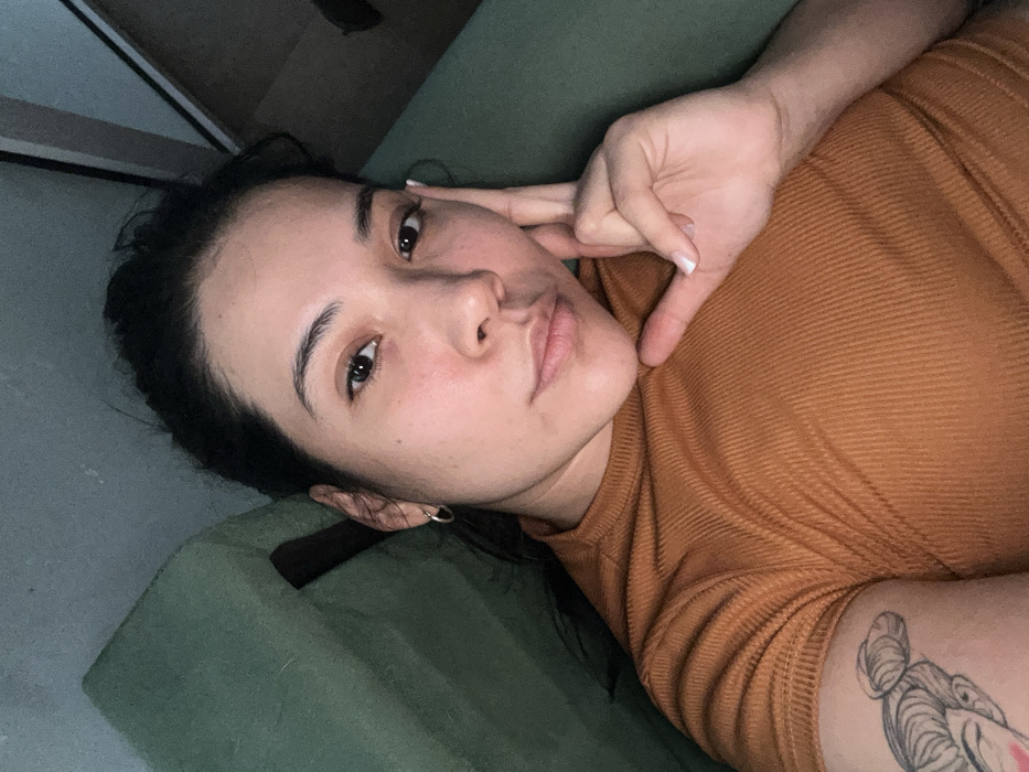 A light-skinned woman with dark hair lies on an olive-green surface. She wears a rust-colored ribbed shirt. Her left hand is positioned near her face, fingers extended along her cheek. She gazes directly at the camera. The background shows a glimpse of a wall. A visible tattoo is on her upper right arm.