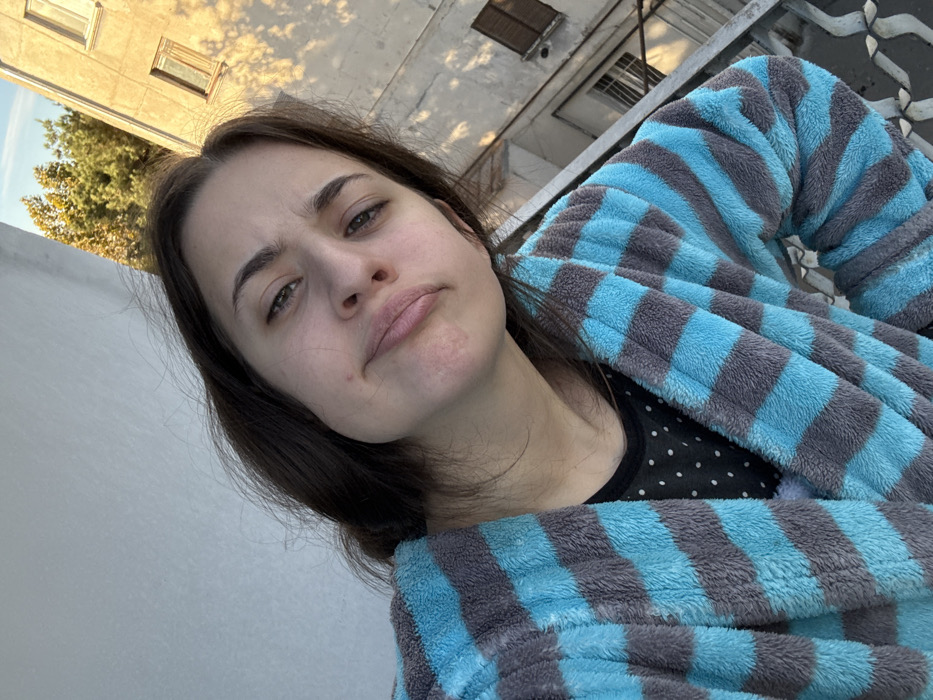 A young adult female, with dark brown hair and a slight pout, is depicted in a selfie taken from an upward angle. She wears a light blue and dark grey striped fleece robe over a dark, polka-dotted top. Minor skin blemishes are visible on her chin and lower jawline. The subject is positioned on an outdoor balcony or terrace. In the background, a light-colored, multi-story residential building with several windows, including one featuring partially closed dark brown shutters and another with visible metal security bars, is illuminated by direct sunlight, casting defined shadows. Green and yellowing tree foliage is present against a clear blue sky. The architecture of the residential building, characterized by stucco walls and metal railings, is consistent with typical urban settings in Tbilisi, Georgia. A decorative metal balcony railing is partially visible in the lower right.