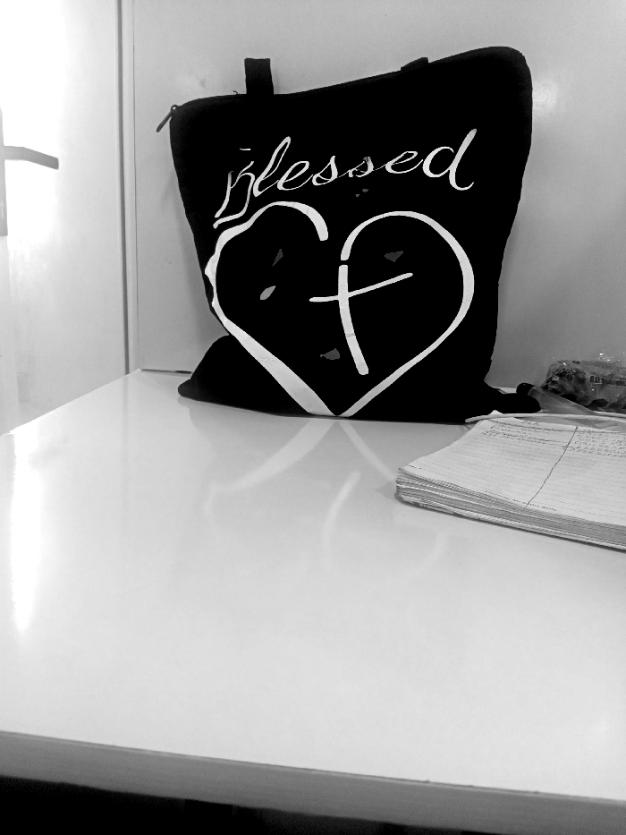 A black and white photograph captures an indoor scene located in Lagos, Nigeria. The central object is an upright black fabric bag, consistent with a tote, resting on a highly reflective, smooth, light-colored surface, likely a tabletop or counter. The bag features white graphical elements: the word "blessed" in cursive script above a prominent heart outline, which encloses a stylized cross. A zipper pull is partially visible on the bag's upper left. The reflective surface below the bag displays a clear, distorted reflection of its design. The background consists of a plain, light-colored vertical surface, possibly a wall, with a partial view of a door handle on the far left. To the right of the bag, a stack of approximately 10-15 sheets of ruled paper, appearing to be from a notebook, lies on the reflective surface, with discernible handwritten text on its top visible page. Behind the notebook, a blurry, lighter object encased in clear plastic is partially visible. No individuals are present, and no actions or interactions are depicted within the static environment.