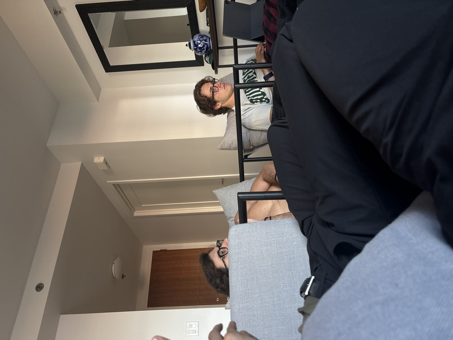 An indoor scene, likely an apartment or residential unit, in Boston, United States, features three individuals
