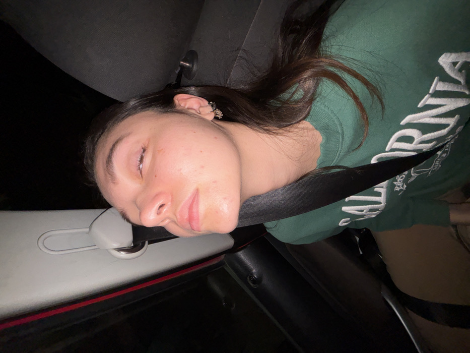 A young woman with long brown hair rests her head against a car's sun visor while wearing a seatbelt. She has fair skin, closed eyes, and a relaxed expression. The background shows the car's interior, including the headrest of the driver's seat. The woman is wearing a green sweatshirt. The lighting is dim, creating a soft, subdued atmosphere.