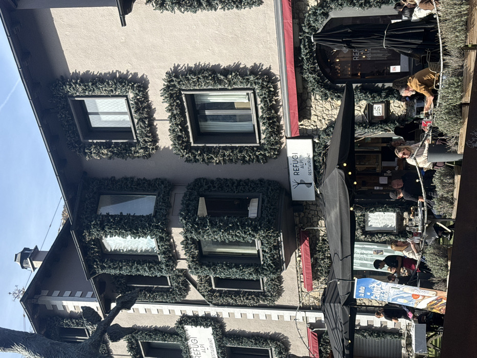 This image captures the exterior of Refugi Alpi Restaurant in Andorra la Vella, Andorra, on a clear, sunny day
