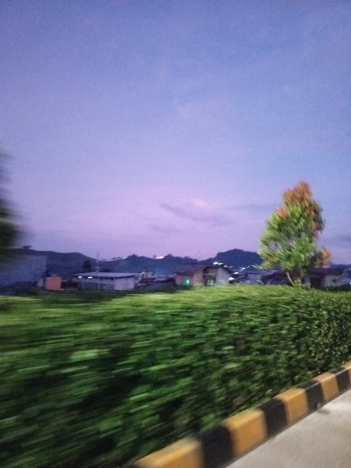 A blurred motion shot shows a green hedge and a young tree with reddish leaves against a twilight sky. In the background, houses dot the landscape beneath dark mountains. A yellow and black striped barrier runs along the bottom right. The sky is a blend of purple and blue. The motion blur suggests the photo was taken from a moving vehicle.