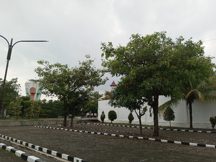 The image depicts an outdoor paved area in Daringbadi, India, under an overcast sky. The foreground features a dark grey paved surface, delineated by alternating black and white painted concrete curbs. A tall, dark street light pole with a horizontal arm and a single fixture is positioned on the far left. Two large deciduous trees with green foliage stand prominently in the mid-ground. To the right, a long, white, solid wall runs horizontally, with several smaller evergreen shrubs planted along its base and a partial view of a palm tree behind the rightmost large tree. In the background, above the tree line on the left, a multi-colored water tower (light green, white, and peach sections) is visible. Further to the right in the background, a building with a reddish-brown, possibly domed roof structure is partially discernible. A small group of indistinct human figures is present in the distant background, appearing near some small flags or banners. No specific actions or interactions are clearly identifiable beyond the distant figures.