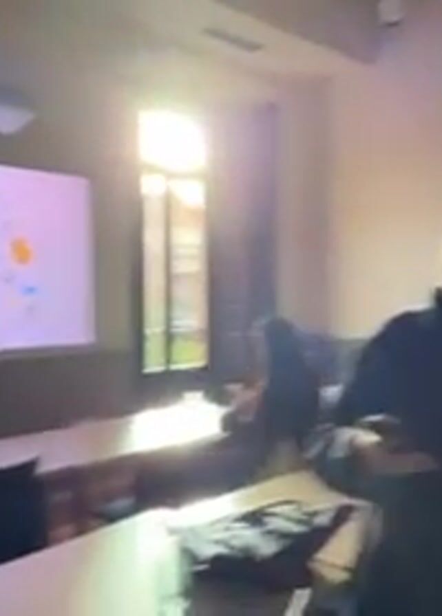 classroom setting with three people. One person is standing near the camera, looking at their phone and adjusting their hair. Another person is standing near a whiteboard giving a presentation, and a third person is sitting at a desk near a window, also looking at their phone. The classroom has rows of desks and chairs, a whiteboard, and a projector screen displaying a graphic of a light bulb surrounded by various icons. There's also a window that is letting in bright sunlight. The overall atmosphere appears to be casual and relaxed.