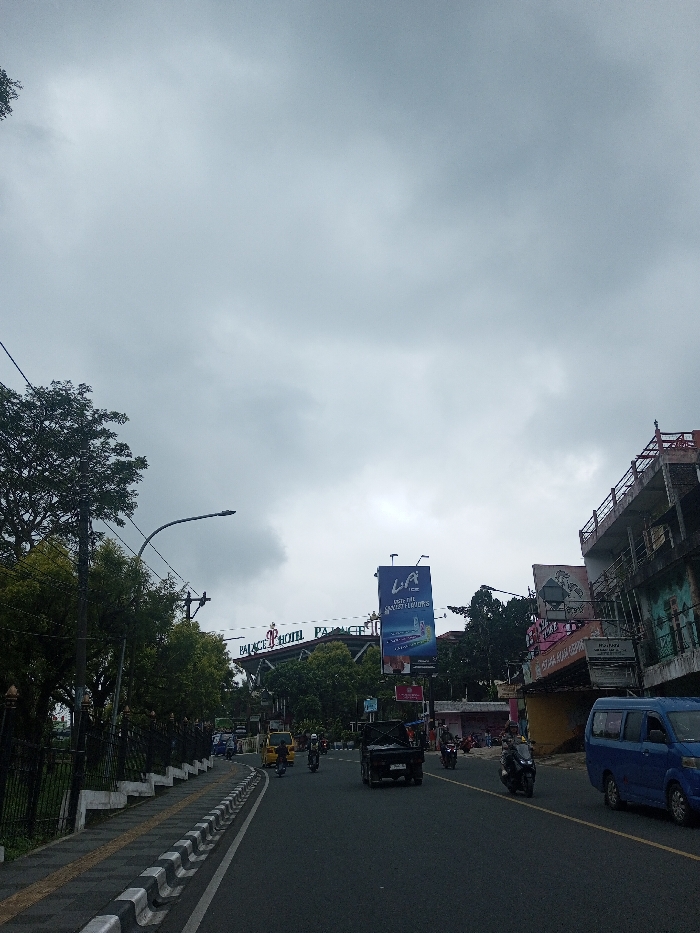 A street view captured under a cloudy sky. The Palace Hotel's sign is visible behind trees and a tall billboard. Cars and motorbikes travel along the road, with a blue van closest to the camera. Buildings line the right side of the street, while trees and a sidewalk are on the left. A streetlamp is positioned near the trees.