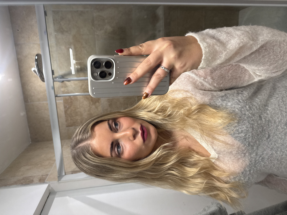 The image displays an adult female taking a mirror selfie in an indoor bathroom. The woman has long, wavy blonde hair parted centrally, light-colored eyes, and wears dark pink lipstick. She is dressed in a light-colored, sheer V-neck knit sweater, under which a dark bra is visible. Her right hand, featuring a silver-toned ring on the ring finger and fingernails painted in a multi-tone gradient of brown, orange, and red, holds a grey, ridged smartphone case, which appears to house an iPhone with a triple-camera system. The background, reflected in the mirror, shows light brown rectangular tiled walls and a glass shower enclosure with a silver frame and handle. A showerhead is partially visible above the shower enclosure. A dark grey towel or fabric is partially visible on the far left. The specific location within Rousset, France, cannot be determined from the visual information provided.