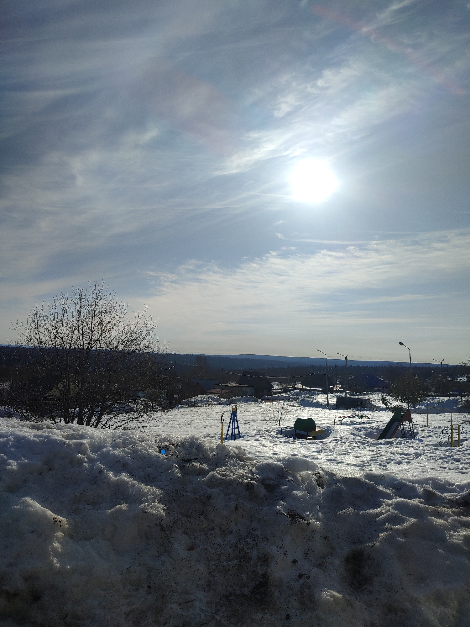 The image depicts a bright, sunny winter scene, likely in a residential or suburban area. The sky is pale blue with wispy clouds. The sun is high and prominent, causing glare. The foreground is dominated by a mound of dirty, melting snow. Behind the snowdrift, there is a playground covered in snow. Visible playground equipment includes slides, a tunnel, and other climbing structures. Bare trees and shrubs are scattered throughout the area. In the background, there are houses and other buildings. Streetlights are sparsely distributed. The horizon line is a mix of forested land and more distant buildings. The location appears to be in a city of Unknown, Unknown. No people are visible.