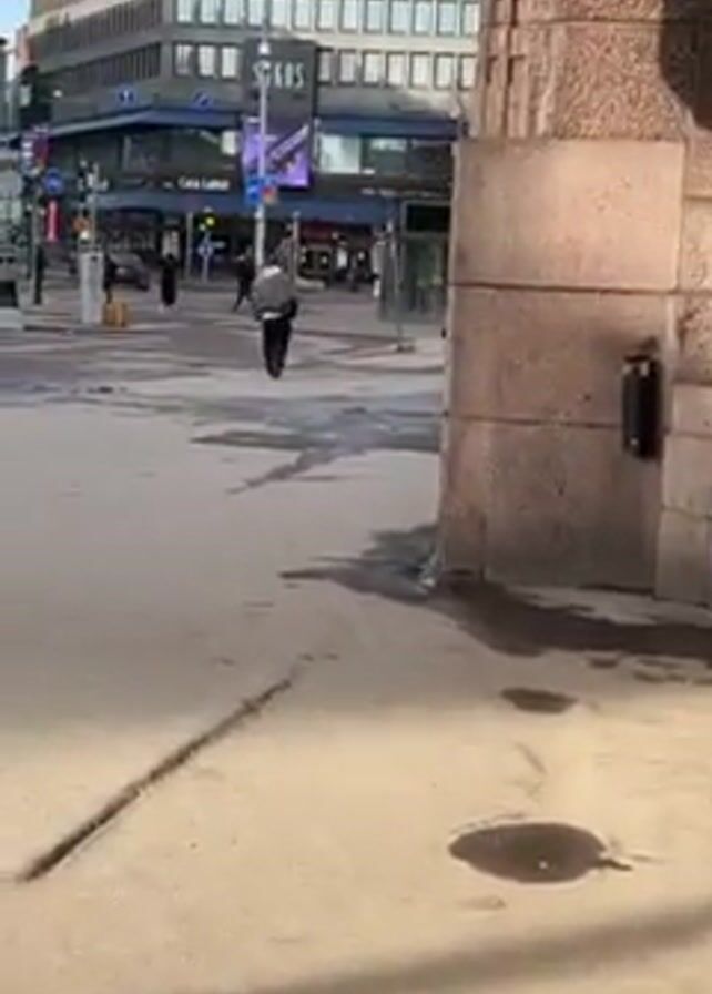 The camera is positioned underneath some sort of structure, possibly a building, looking out onto a city street. Pedestrians can be seen crossing the street. One man wearing a black jacket and a backpack crosses first, followed by a group of three people and a lone individual. There are large, modern buildings lining the street. "CITYCENTER" and "ELIXIA" are displayed on the facade of one. The sky is bright and the sun is visible. There's a tram line running through the street. The road surface is wet, and there is a puddle on the sidewalk in the foreground.