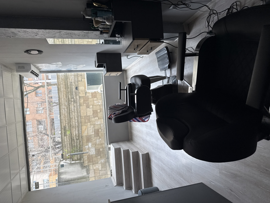 The image depicts the interior of an unoccupied barbershop or hair salon located in Blagoevgrad, Bulgaria