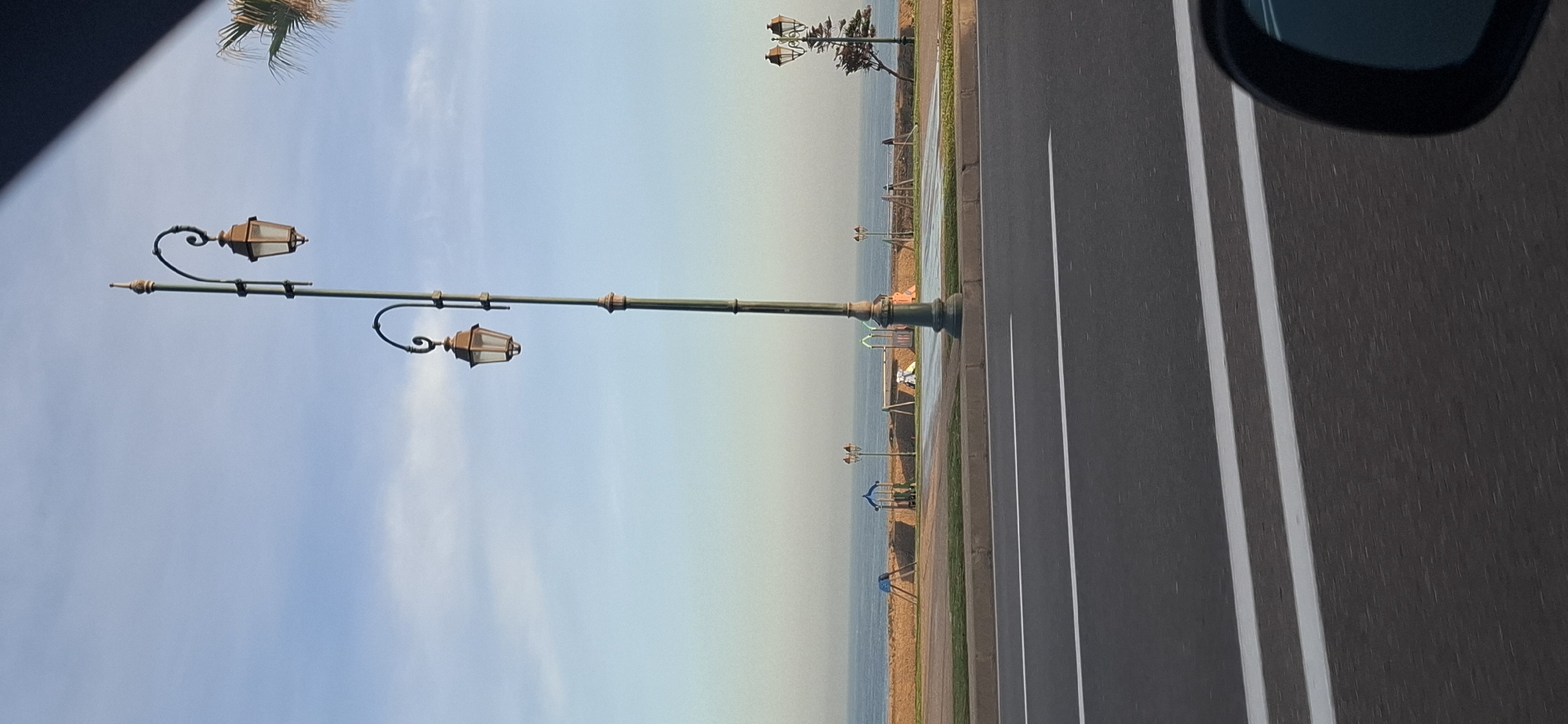 The image captures a coastal scene in Rabat, Morocco, likely along the Corniche or Boulevard Front de Mer. In the foreground, a dark asphalt road displays two parallel solid white lines marking a lane or road edge. A dark vehicle's side mirror is partially visible in the bottom right corner. A tall, dark green street lamp, featuring two ornate, bronze-toned lanterns, dominates the central frame, extending from the bottom quarter towards the top. Beyond the road, a grassy median separates it from a paved promenade situated along the coastline. This promenade contains multiple colorful playground structures, including blue, green, and white elements such as slides, swings, and climbing frames. Several other decorative street lamps with similar ornate designs are spaced along the promenade. A low stone wall separates the promenade from the Atlantic Ocean, which occupies the background as a calm expanse of dark blue water. A faint, hazy landmass is discernible on the distant horizon. The sky is clear light blue with a slight gradient towards the horizon. A fragment of a palm tree frond is visible in the upper right. No individuals are present in the scene.