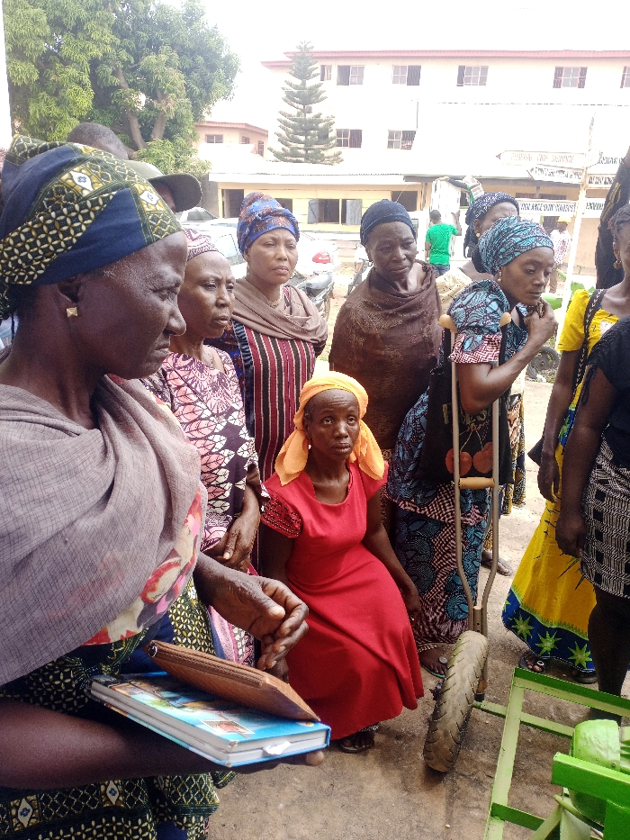 A group of approximately ten individuals, predominantly older women, are gathered outdoors during daylight hours in Unknown, Unknown. The scene is set on an unpaved, light brown ground surface. In the foreground, a dark-skinned woman with a patterned blue and gold head wrap and a grey-brown shawl holds a light blue book with a colorful cover and a brown wallet in her left hand. To her right, a woman in a red dress and orange head wrap kneels or sits on the ground, looking directly at the viewer. Another woman in a blue and black patterned dress stands with the aid of a single underarm crutch. The women wear various traditional patterned fabrics and head coverings. In the background, a light-colored, two-story building with multiple windows is visible, partially obscured by a tall evergreen tree and other foliage. Several motorcycles or mopeds are parked near the building. A partially visible green machine with a single wheel is present in the lower right foreground. The overall impression is an outdoor gathering or event.