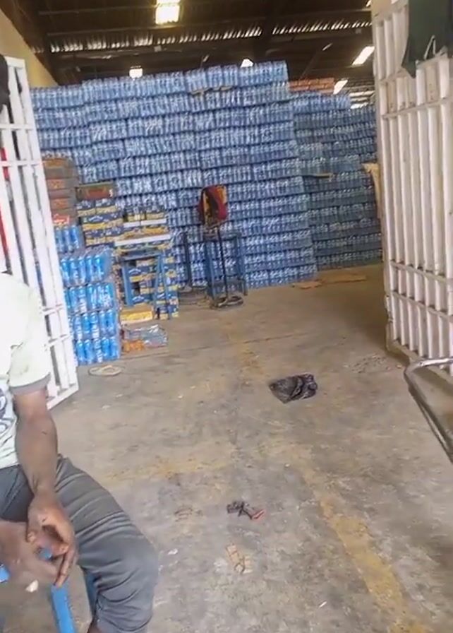 interior of a warehouse. A man is sitting on a blue stool in the foreground. Behind him, there are stacks of bottled water, piled high against the back wall. There are also smaller stacks of water bottles on the left side of the frame. A black plastic bag and some small metal objects lie on the concrete floor. A metal gate-like structure is on the right. The warehouse has a high ceiling and industrial lighting.