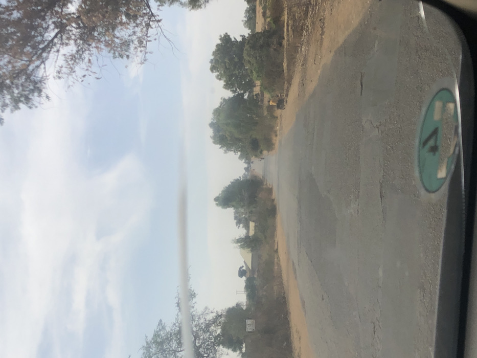 The image displays a paved road in Mangu Town, Nigeria, viewed from the interior of a vehicle. The asphalt road surface shows extensive cracking and patching, extending into the distance with a gradual incline. The immediate foreground reveals a portion of a vehicle's dashboard or windshield, including a green circular sticker marked with a white "4." The roadside environment features dry, light brown earth with sparse, desiccated vegetation and shrubs. Trees with varying foliage density line both sides of the road. On the left side, in the mid-ground, multiple single-story buildings with light-colored roofs are partially visible behind vegetation, alongside a utility pole and an unreadable white rectangular sign with dark text. On the right side of the road, at mid-distance, a single individual wearing a yellow shirt is seated on a motorcycle, which is parked off the paved surface on the dirt shoulder. Further down the road, indistinct human figures are visible. The sky is light blue with scattered white clouds, and a horizontal dark streak, consistent with a windshield anomaly or reflection, traverses the upper-left area. The scene is illuminated by daylight, consistent with a semi-arid, rural to semi-urban setting.