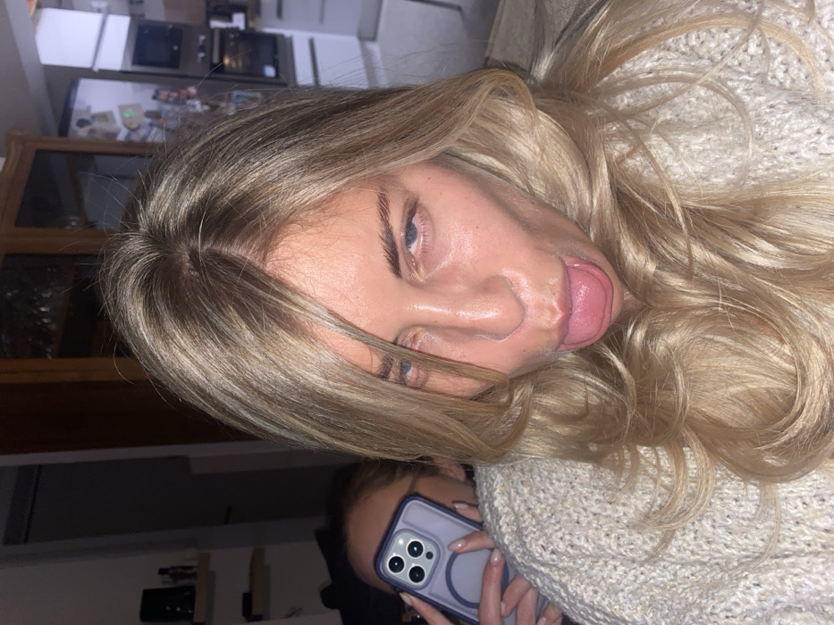 A medium-shot photograph taken indoors, depicting two individuals in what appears to be a residential setting within the city of Lille, France. The central subject is a woman with long, blonde hair, facing the camera directly. She exhibits an exaggerated facial expression, with her eyes rolled upwards and her tongue fully extended downwards. She is wearing a cream-colored, cable-knit sweater. Positioned behind and to the left of the central subject, a second individual is partially visible, primarily showing their hands, forehead, and part of their nose. This second person is holding a light purple smartphone, identifiable as an iPhone Pro model by its distinct triple camera array and a visible MagSafe ring on the rear. The background on the left is dimly lit, revealing a dark wall with a shelf holding small, indistinct objects. The right side of the background is brighter, featuring a kitchen area with a dark wooden cabinet equipped with glass doors, a stainless steel refrigerator, a built-in oven, and white kitchen cabinetry.