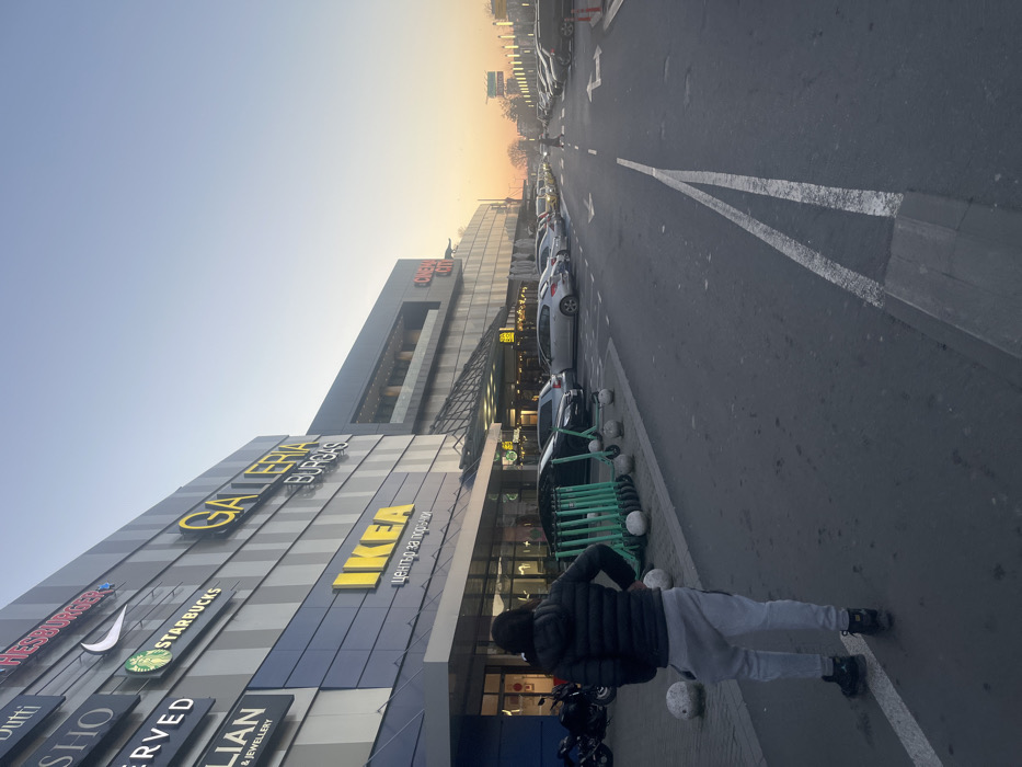 The image presents an exterior view of Galleria Burgas shopping mall in Burgas, Bulgaria, during the late afternoon or early evening at sunset. The multi-story commercial building, featuring a modern facade, occupies the left and central frame. Prominent signage visible on the building includes "GALLERIA BURGAS" in large yellow letters, a significant "IKEA" sign with accompanying Cyrillic text "център за поръчки" below it, and "CINEMA CITY" further down. Other visible store names are "Starbucks," "Nike," "HESSBURGER," "Dutti," "SHO," "RESERVED," and "LIAN & JEWELLERY." In the foreground, a single individual is observed from behind, standing on a paved area next to a curb. The person is wearing a dark puffer jacket, light grey sweatpants, and dark athletic shoes, with hands placed on their hips, facing the mall. Along the curb, several concrete bollards are visible, against which a row of approximately eight green electric scooters are parked. Multiple motorcycles are parked near the ground-level entrance labeled "IKEA." An asphalt road, marked with double white solid lines centrally and a single white line closer to the curb, extends from the foreground into the midground. Numerous passenger vehicles of various makes and colors are parked in bays adjacent to the mall building. In the far distance, more parked vehicles and a faint silhouette of a pedestrian are visible. The sky transitions from light blue overhead to an orange and pink hue near the horizon, consistent with a sunset. Distant trees and streetlights are discernible on the horizon.