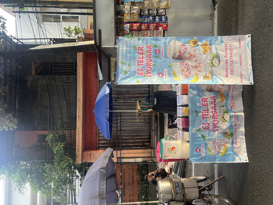 An Indonesian street food vendor sells "Es Teler Syurgaaa," a refreshing shaved ice dessert with various toppings