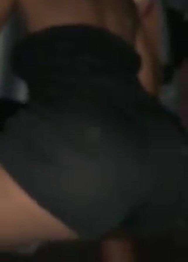 A woman is seen from the back, wearing a black outfit consisting of shorts and a top. She is dancing with a hip-shaking motion in an indoor setting, possibly a bedroom, with a patterned carpet. The room is dimly lit.