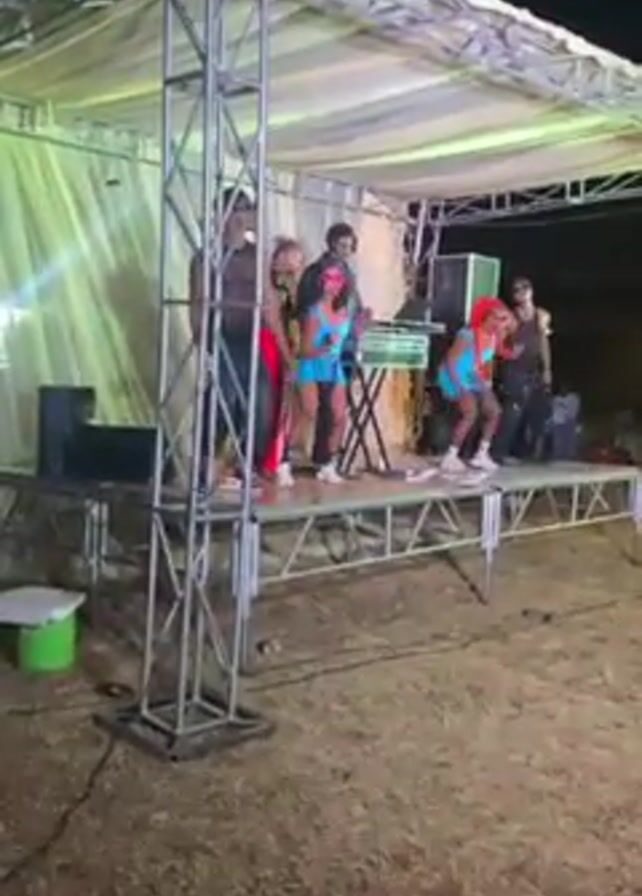 performance taking place on an outdoor stage. The stage is constructed of metal scaffolding and has a white tarp roof. Five people are visible on stage. Two women are wearing matching outfits consisting of a bright blue top and shorts. They are dancing energetically to the music. A man in a suit is playing a keyboard, while another man in sunglasses and black clothing stands to the side. Another man is also on the stage, further to the left. Behind the performers is a screen. Speakers are placed on either side of the stage. A green container sits on the ground to the left of the stage. The ground surrounding the stage is grassy and dry. The event seems to be taking place at night, with artificial lighting illuminating the stage. The camera perspective is from below the stage, looking up. A crowd of people can be seen in the background, further to the right.