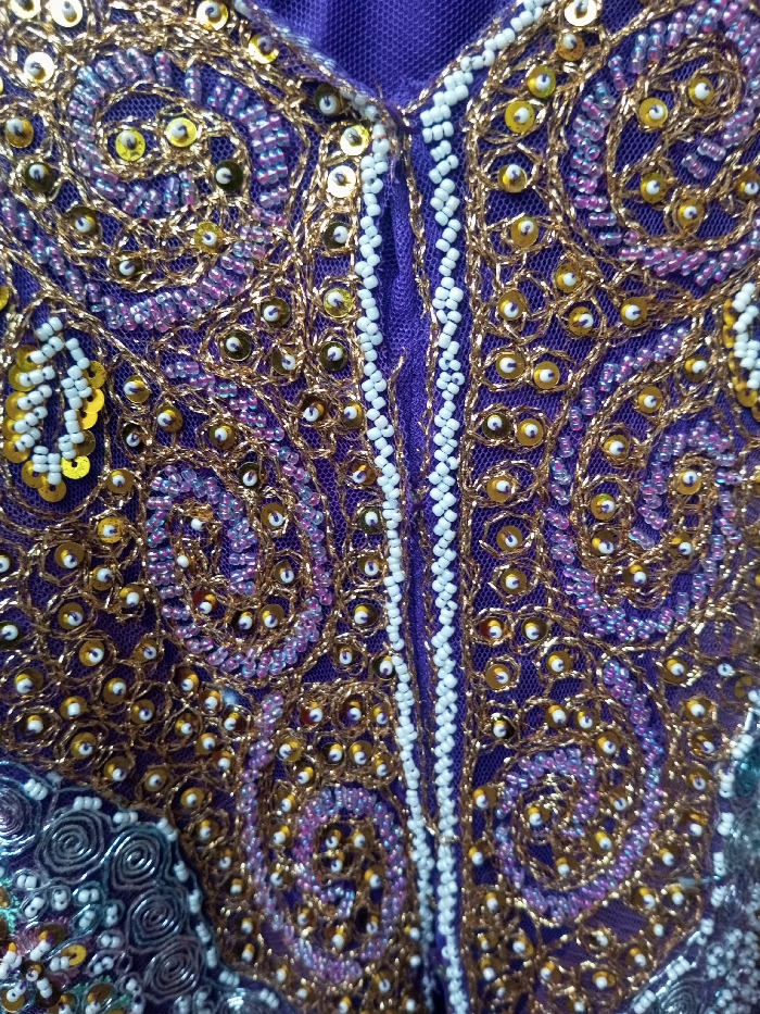 Close-up shows intricate beadwork on a purple garment