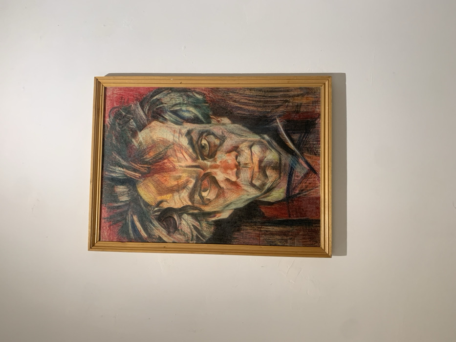 A framed portrait hangs on a plain, white wall. The artwork depicts a person with prominent features, including large eyes and a furrowed brow. The style is expressionistic, with visible pencil strokes and a color palette of reds, yellows, and browns. The subject's head is slightly tilted. The frame is a simple gold color. A subtle shadow is visible to the right of the frame, suggesting a light source from the left.