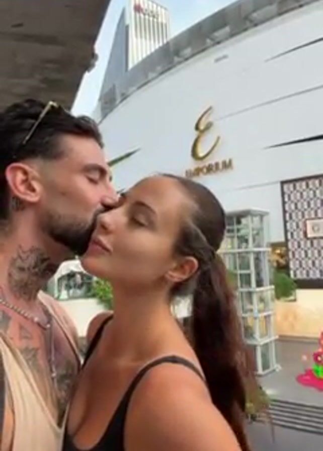 A man and a woman are standing close together and kissing. The man is on the left side of the frame, and the woman is on the right. The man has dark hair and a beard, and he is wearing a tank top. He has multiple tattoos on his neck and chest. The woman has dark hair pulled back in a ponytail, and she is wearing a black tank top. Behind them is a large building with a sign that says "EMPORIUM." There is a taller building in the background and some greenery and street furniture visible at the bottom of the frame. The lighting suggests it is daytime.
