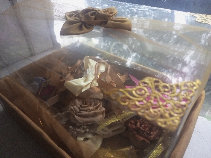 - "An overhead, slightly angled view captures a decorative gift box with a transparent lid, adorned with sheer, light brown netting and a matching fabric bow, situated in Zee Pin Kone, Myanmar" by FM-DsQqc2, licensed under CC BY 4.0