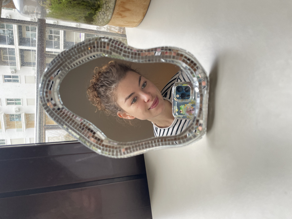 - "An irregularly shaped mirror, framed with a mosaic of small, reflective tiles, stands on a light-colored surface within an interior setting in Boreti, Montenegro" by FM-GgSpJ3, licensed under CC BY 4.0