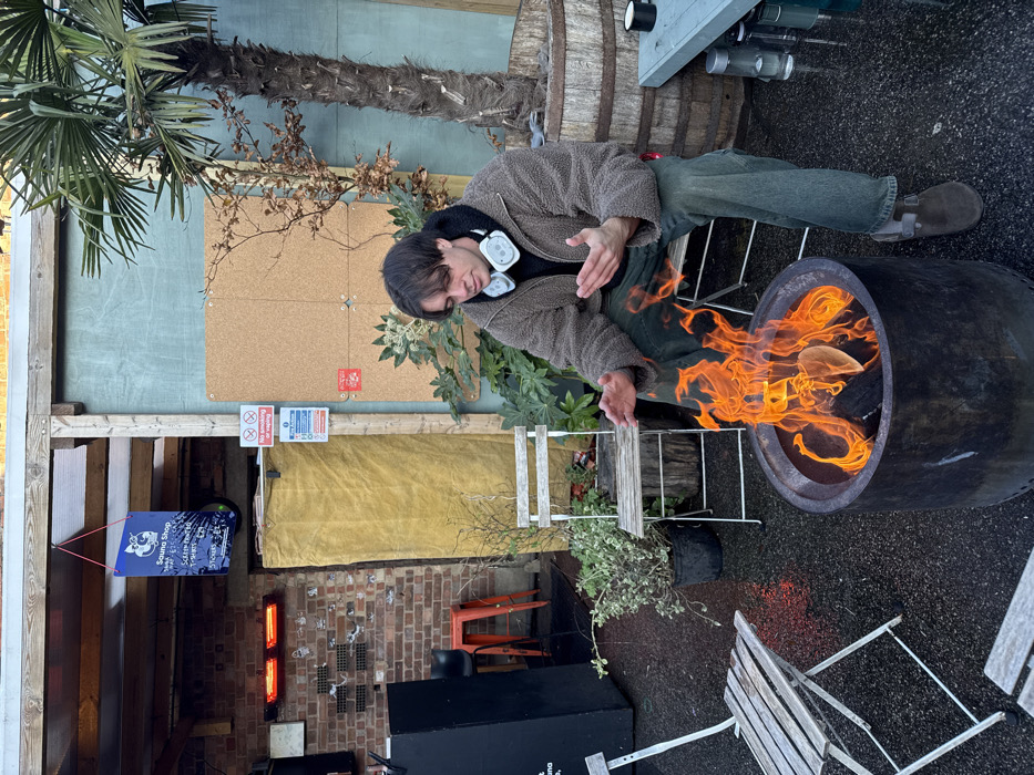 An outdoor patio scene, likely at Peckham Rye Sauna in Peckham, Greater London, United Kingdom, features a male individual warming his hands over a burning fire pit