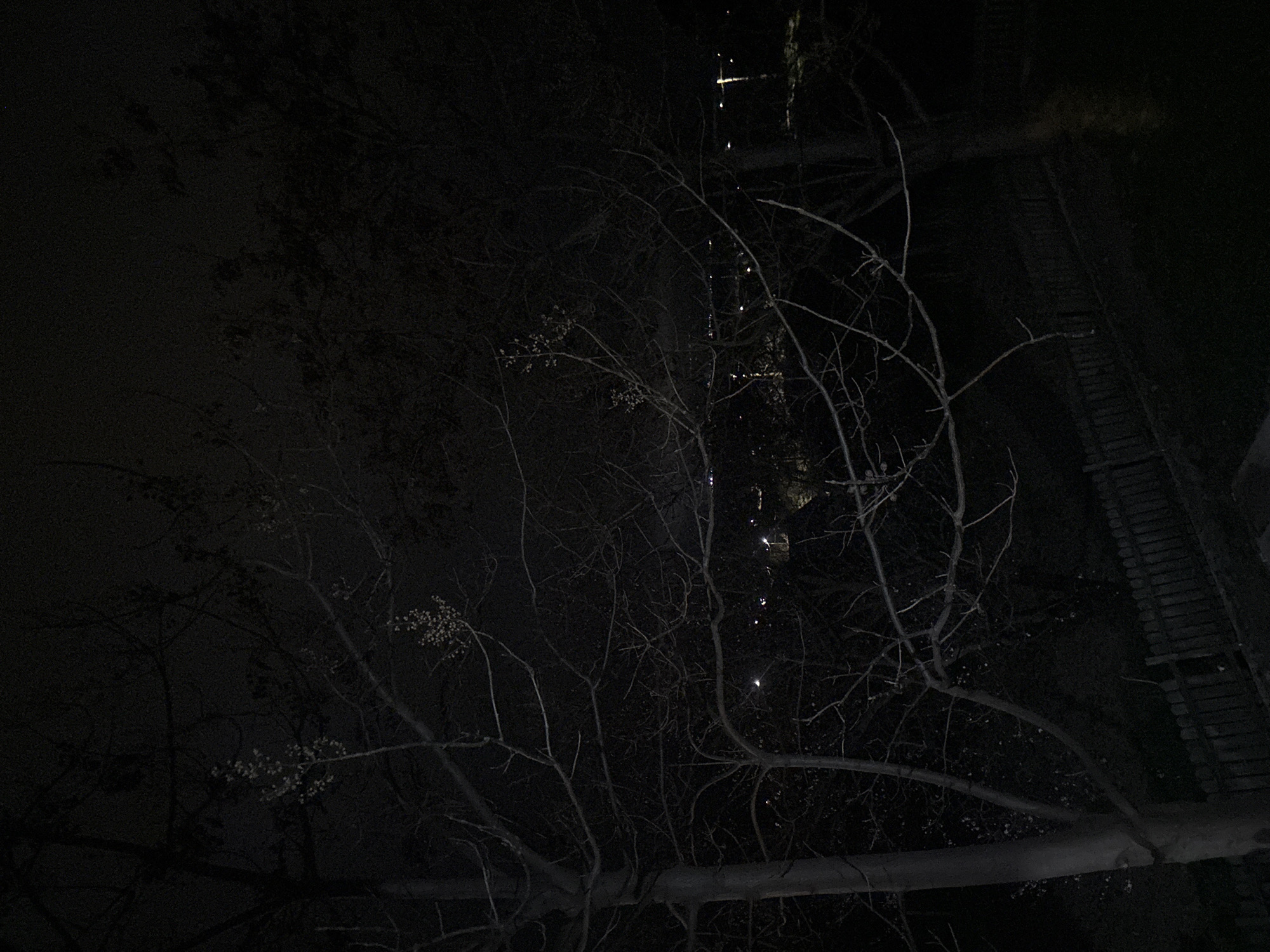 A nighttime scene in Goritsa, Bulgaria, captured from an elevated perspective. The foreground and midground are dominated by the dark silhouettes of several leafless deciduous trees with intricate bare branches, some bearing small, light-colored clusters consistent with dormant buds or early blooms. A thick tree trunk is prominent on the left side of the frame. In the lower midground, a dark wooden picket fence runs horizontally, delineating a property line above an indistinct dark ground area. The background features a distant urban or residential landscape, characterized by scattered, faint artificial lights indicating buildings, roads, or infrastructure, all beneath a dark, presumably overcast, sky. No individuals or specific activities are observable.