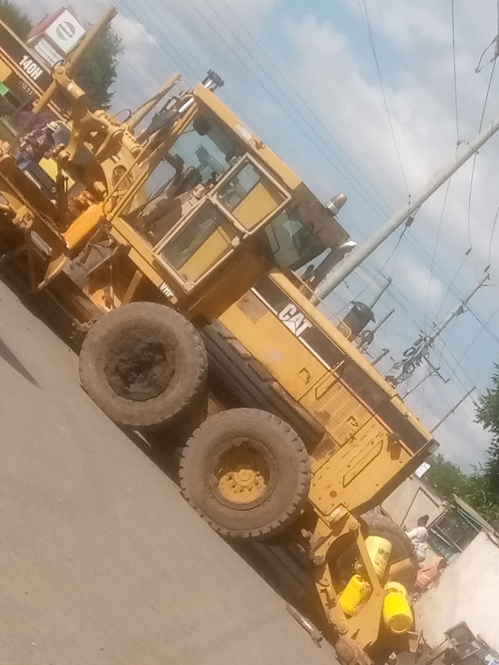 - "A yellow Caterpillar (CAT) 140H motor grader is stationary on a paved road surface in Nyahururu, Kenya, under a partly cloudy sky" by FM-6Q4Sw2, licensed under CC BY 4.0