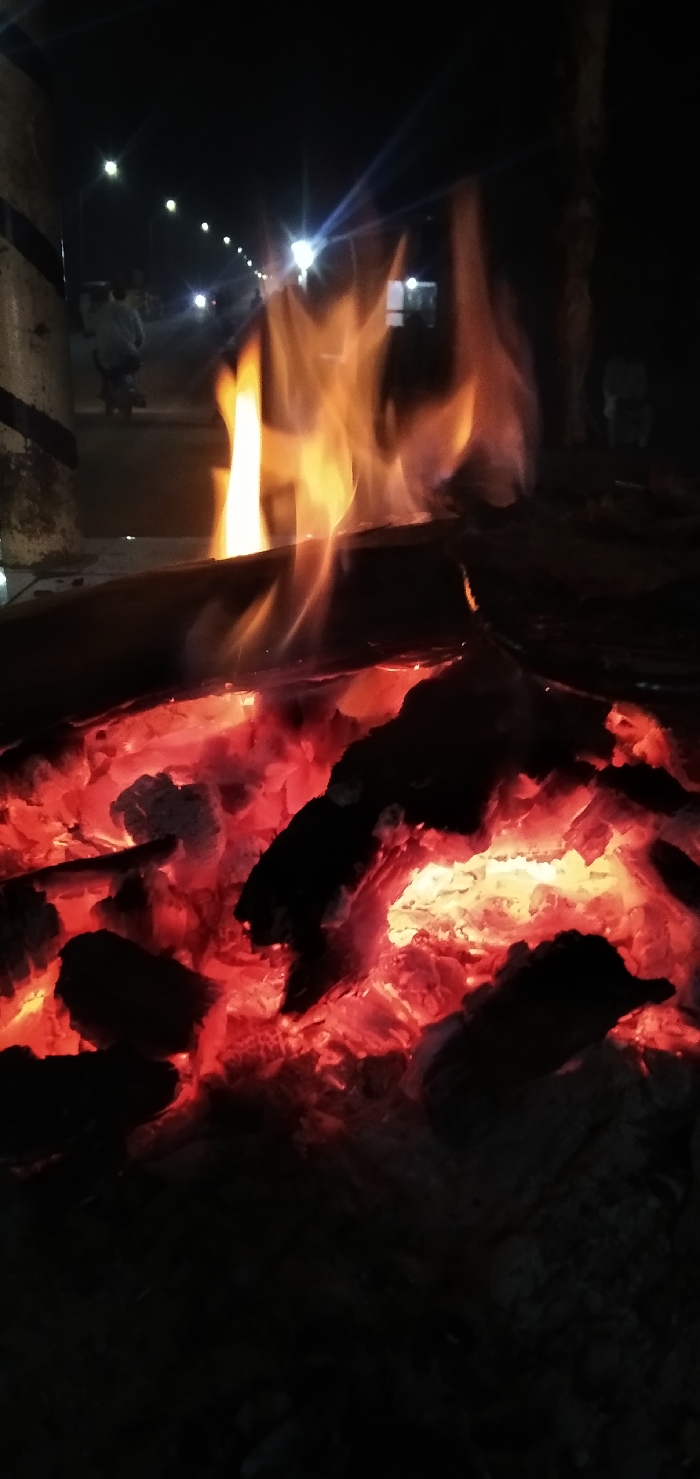 A vibrant fire dominates the foreground, with glowing red embers and flickering orange flames rising from dark wood. In the blurred background, a road is visible, lined with evenly spaced streetlights and the silhouettes of people. The contrast between the warmth of the fire and the cool darkness creates an intriguing night scene.