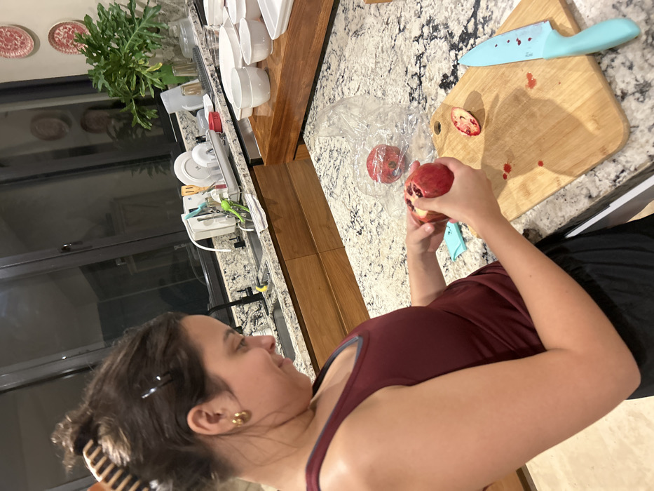 A woman in a maroon tank top stands in a kitchen. She holds a partially cut pomegranate. A cutting board with a slice of pomegranate, a blue knife, and scattered pomegranate seeds is to her right. A pomegranate sits in a plastic bag. The kitchen features light-colored granite countertops, wooden cabinets, and a plant near a window with visible plates.