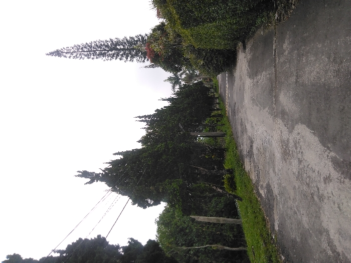 This image depicts a paved road extending into the distance within Ignacio Zaragoza (La Rastrera), Mexico, under an overcast sky. The dark gray, asphalt or concrete road exhibits significant wear, with lighter gray patches, cracks, and textural variations. No lane markings are present. On the left side of the road, a narrow strip of green grass borders the pavement, followed by a row of tall, dark green coniferous trees. At least two utility poles are visible along this tree line, supporting three overhead power lines. Denser green foliage extends further into the background on this side. On the right side of the road, a continuous, dense green hedge or shrubbery runs parallel to the pavement. Behind this hedge, various trees are visible, including one exceptionally tall, slender, dark green coniferous tree prominently rising against the sky. Other trees with both green and reddish foliage are also present. The sky is uniformly light gray and overcast. No individuals, animals, or vehicles are present in the scene.